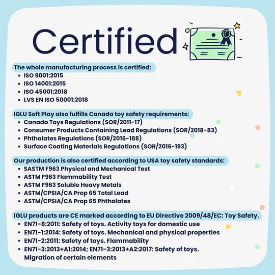 IGLU tooted on CE-märgistusega vastavalt EL direktiivile 88/378 / EÜ: Mänguasjade ohutus, mis teeb need täiesti ohutuks väikelastele.