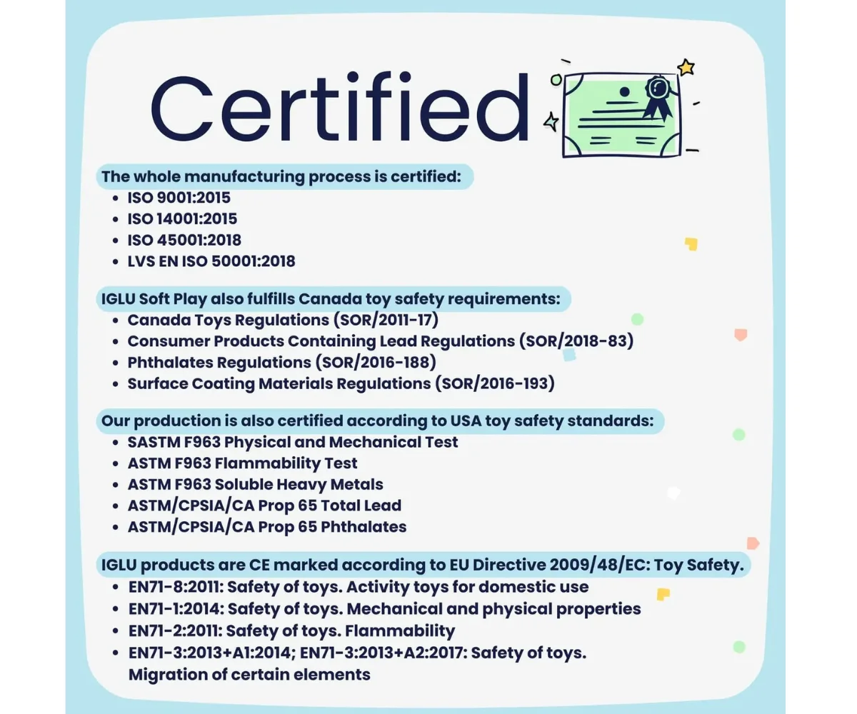 IGLU tooted on CE-märgistusega vastavalt EL direktiivile 88/378 / EÜ: Mänguasjade ohutus, mis teeb need täiesti ohutuks väikelastele.